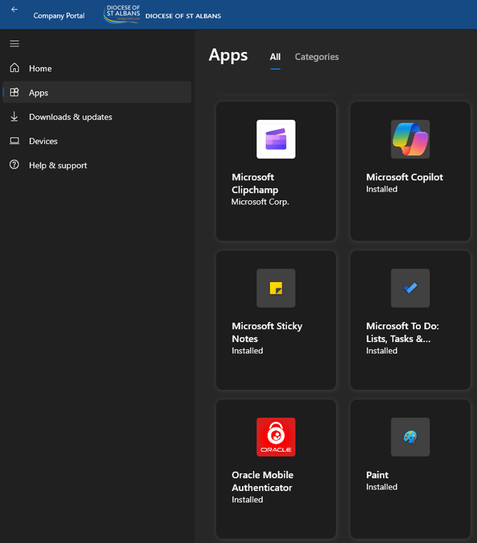 If the app is either approved or not found in the list, please raise a support ticket with the app's details. The diocesan IT team will review your request, determine if there are similar apps or services currently available to suggest to you, and if appropriate, add the requested app to the Company Portal for you to install on your diocesan device.