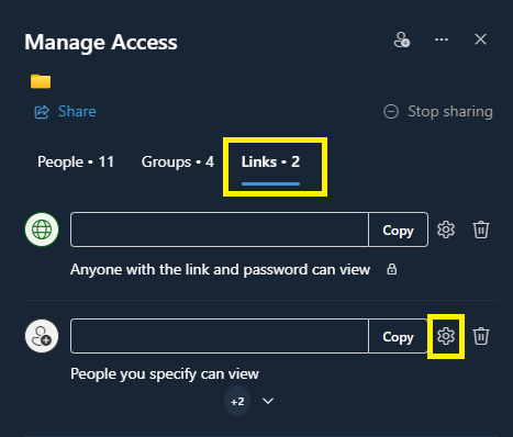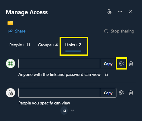 - By the existing Anyone with the link and password can view link select the ⚙️cog icon
