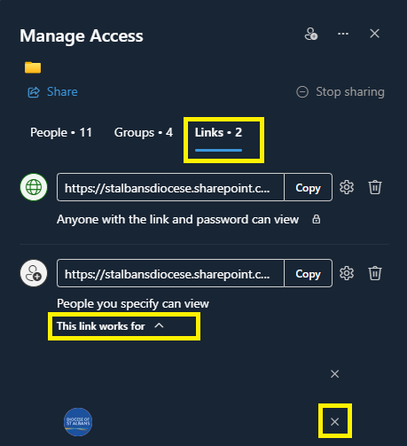 - Enables member to see folder listed at stalbansdiocese.org/meetings. Note they will also be able to use the share link with password.