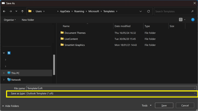 In the Save As dialog box, in the Save as type list, select Outlook Template.