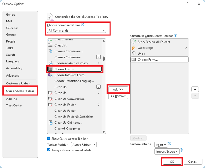 - The shortcut to New Items > More Items > Choose Form will be added to your Quick Access Toolbar