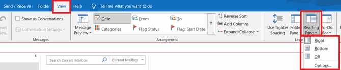 On the View tab, in the Layout group, select Reading Pane, and then select Options.