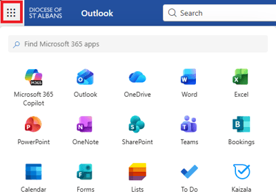 - Your diocesan email account should now be open. Select the 9 squares in the top left corner to switch to a different Microsoft app.