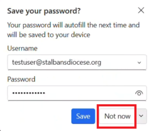- Select Not now to prevent your password being saved in your personal Edge profile