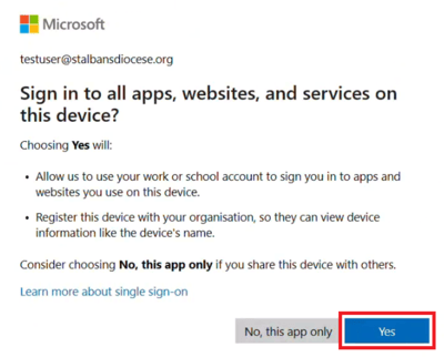 - Select Yes to Sign in to all apps, websites, and services on this device?