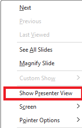 - If you've started the presentation already, right-click and choose Show Presenter View on the context menu