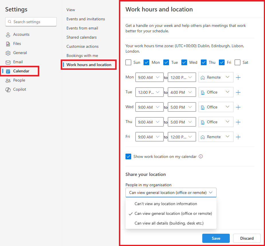 Set work hours and location in Outlook New & Outlook on the Web