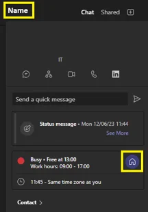 If you want to quickly look up where someone is working from, you can view their location in their profile card next to their availability. Select or hover over their name:
